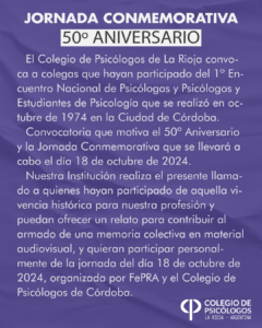 El Colegio de Psicólogos de La Rioja convoca a colegas que hayan participado del 1º Encuentro Nacional de Psicólogas y Psicólogos y Estudiantes de Psicología que se realizó en octubre de 1974 en la Ciudad de Córdoba.